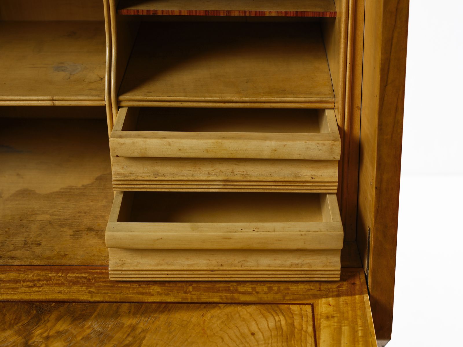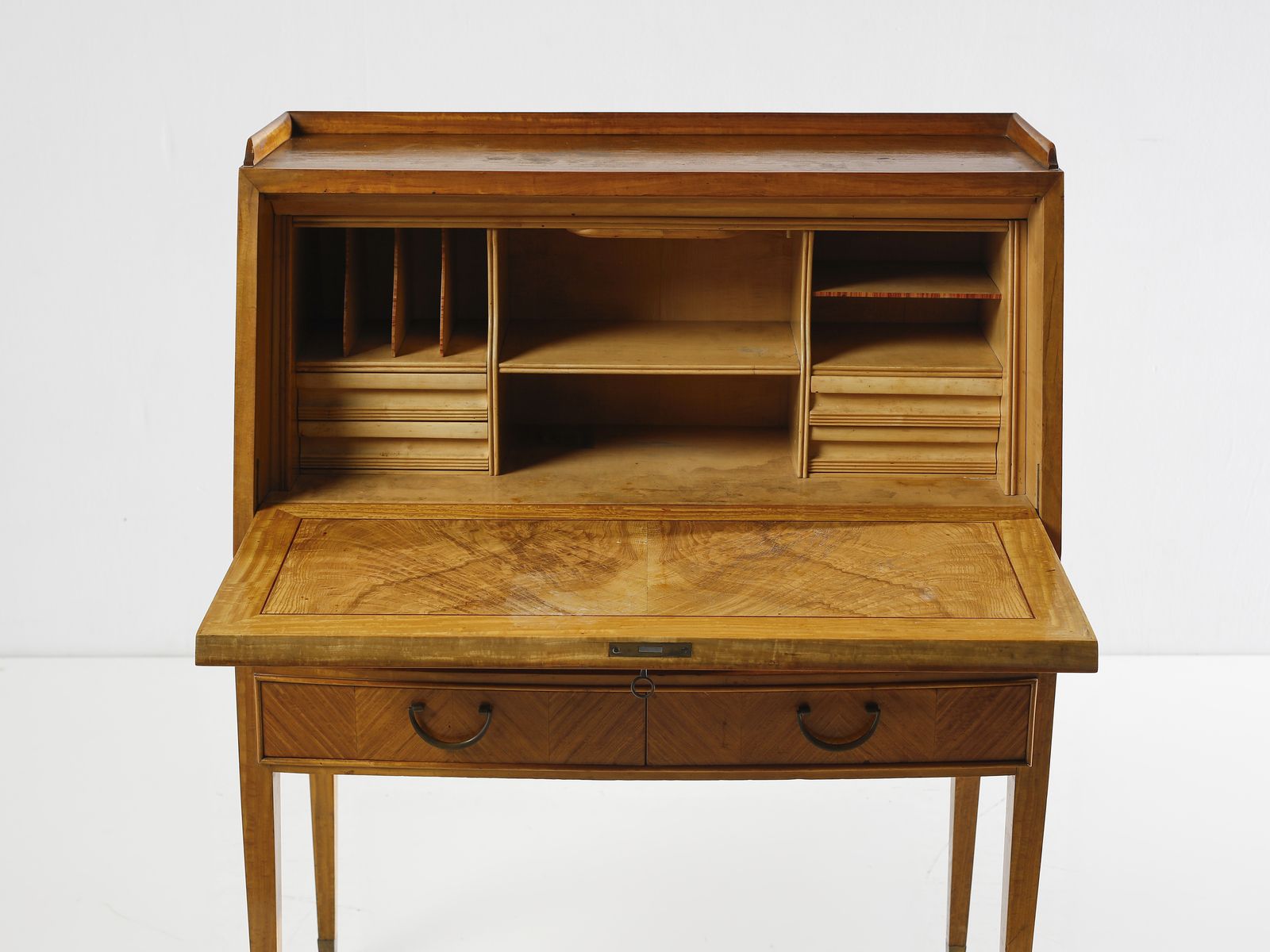 Scrittoio a ribalta con fronte e cassetti ritmati da un andamento a spina di pesce, [..]