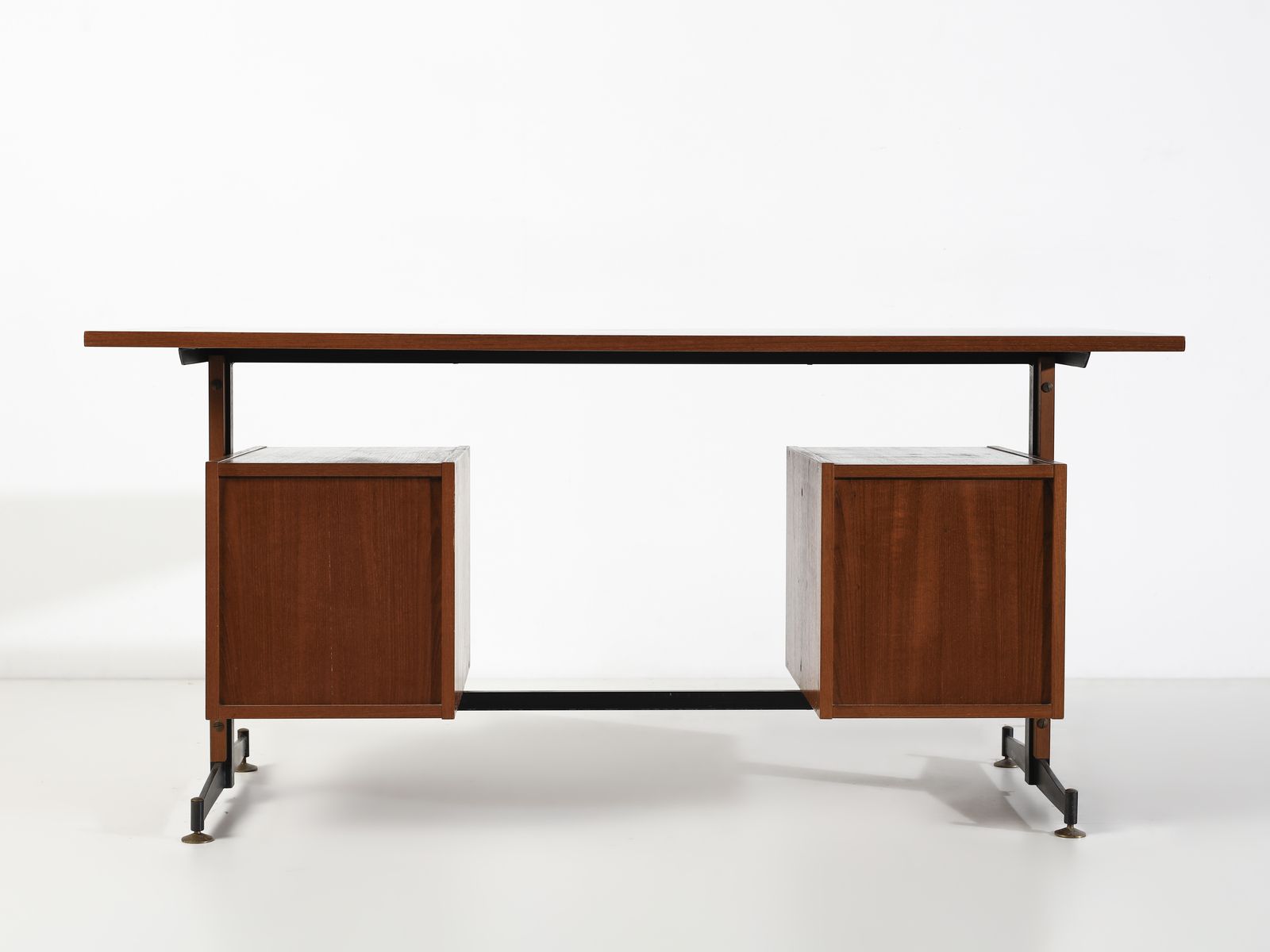 MANIFATTURA BRIANZOLA Scrivania. Legno di teak, ferro verniciato e ottone.. Cm 76,50x159,50x79,50. Anni Cinquanta / Sessanta.