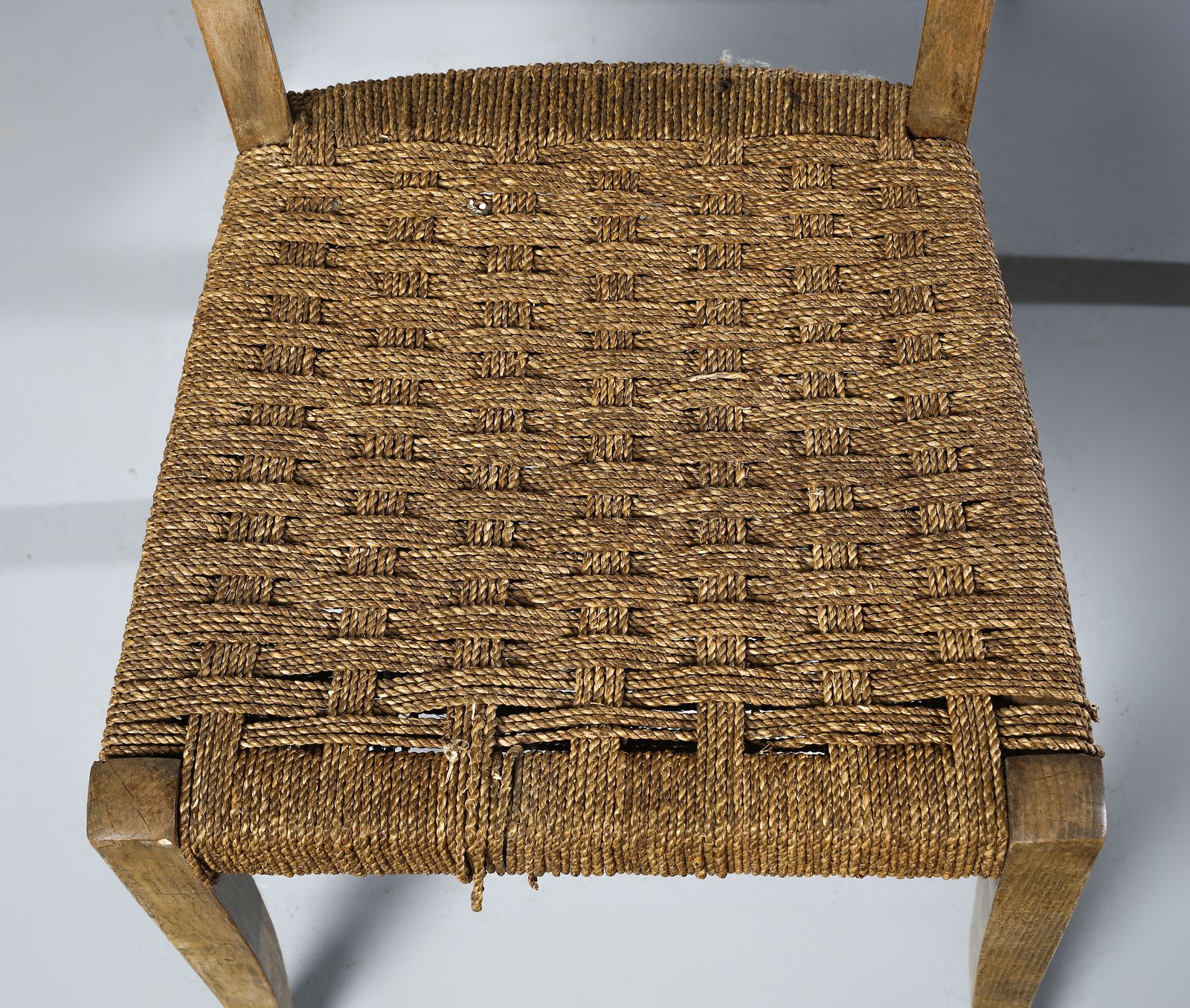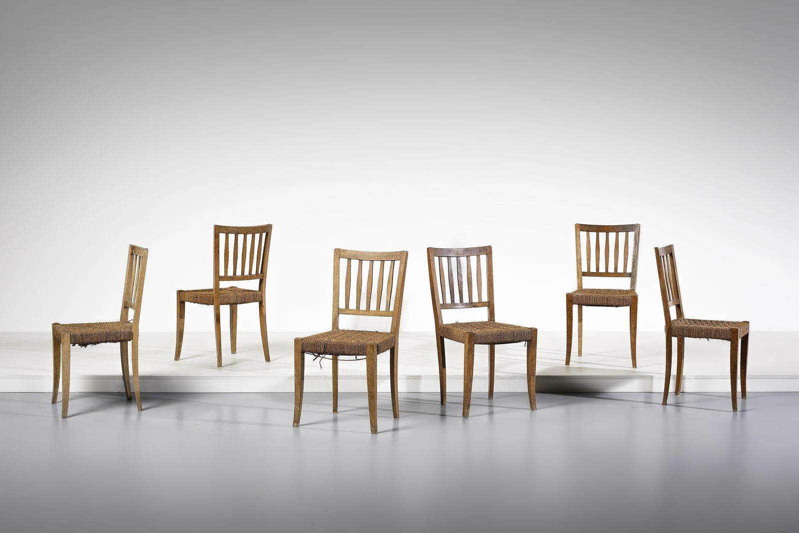 PECORINI GUGLIELMO Sei sedie. Legno e corda.. Cm 89x45x42. Anni Cinquanta.Bibliografia: I. de Guttry, M. P. Maino, Il mobile déco italiano, Laterza, Roma-Bari, 2006, p. 197