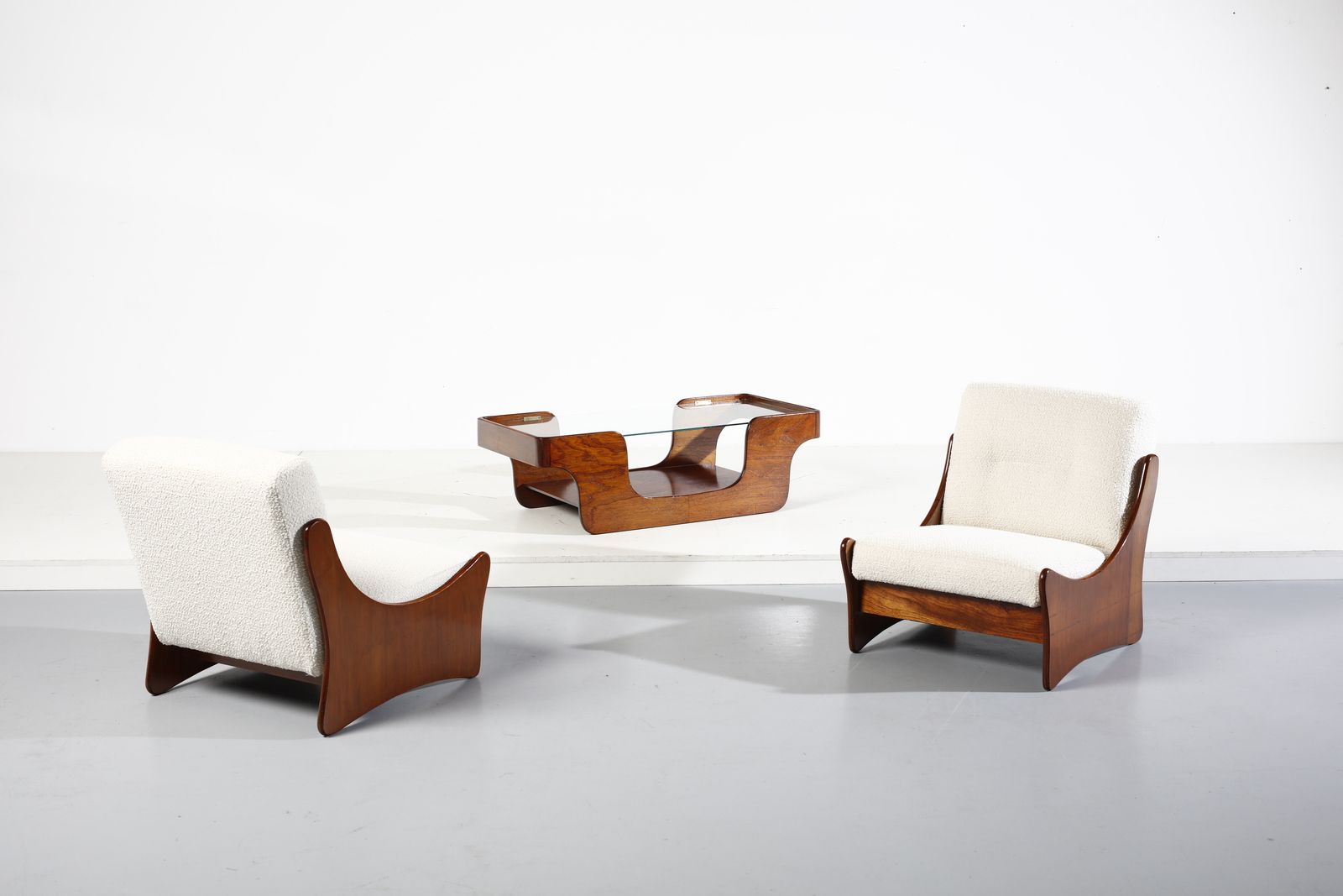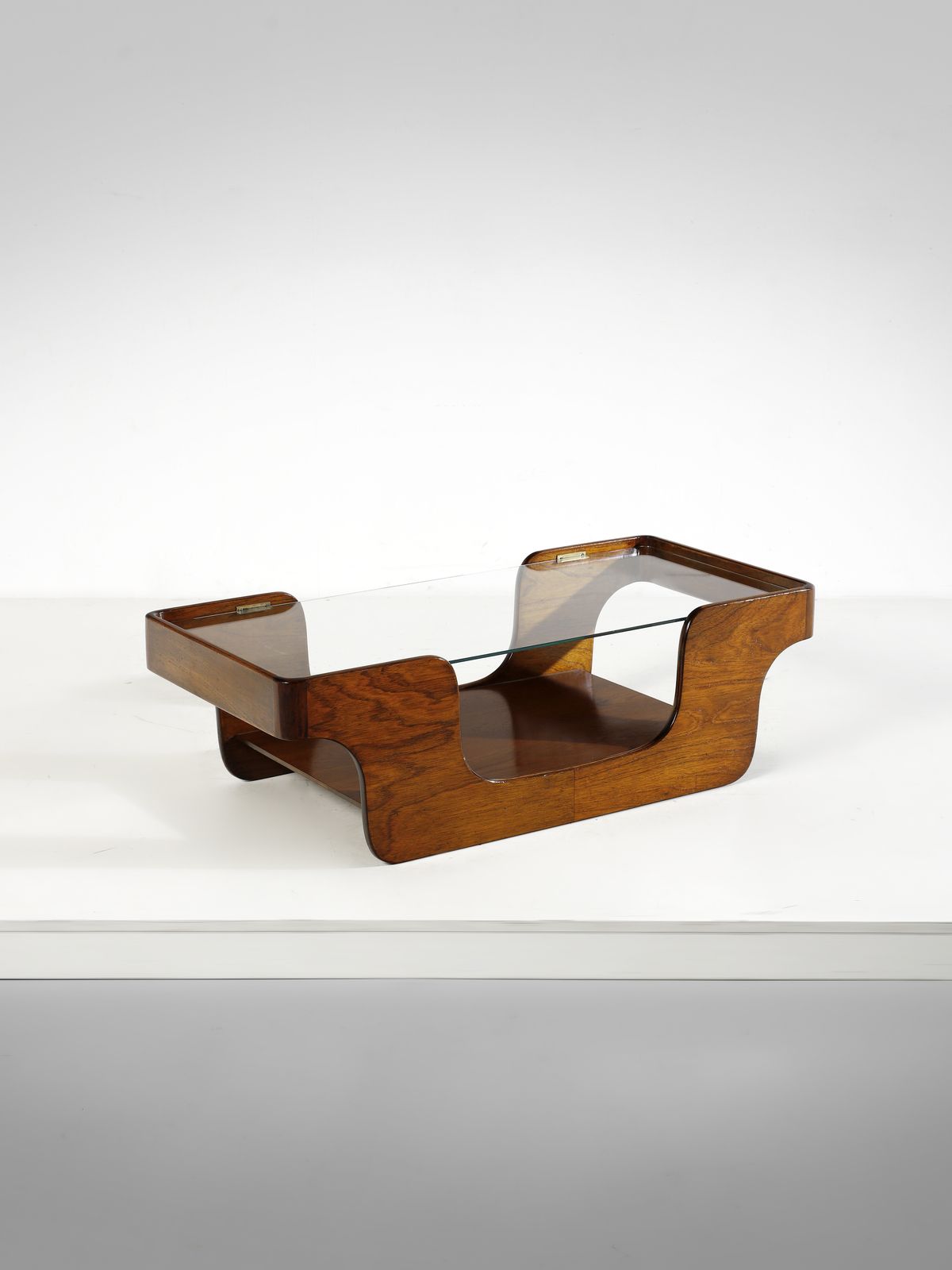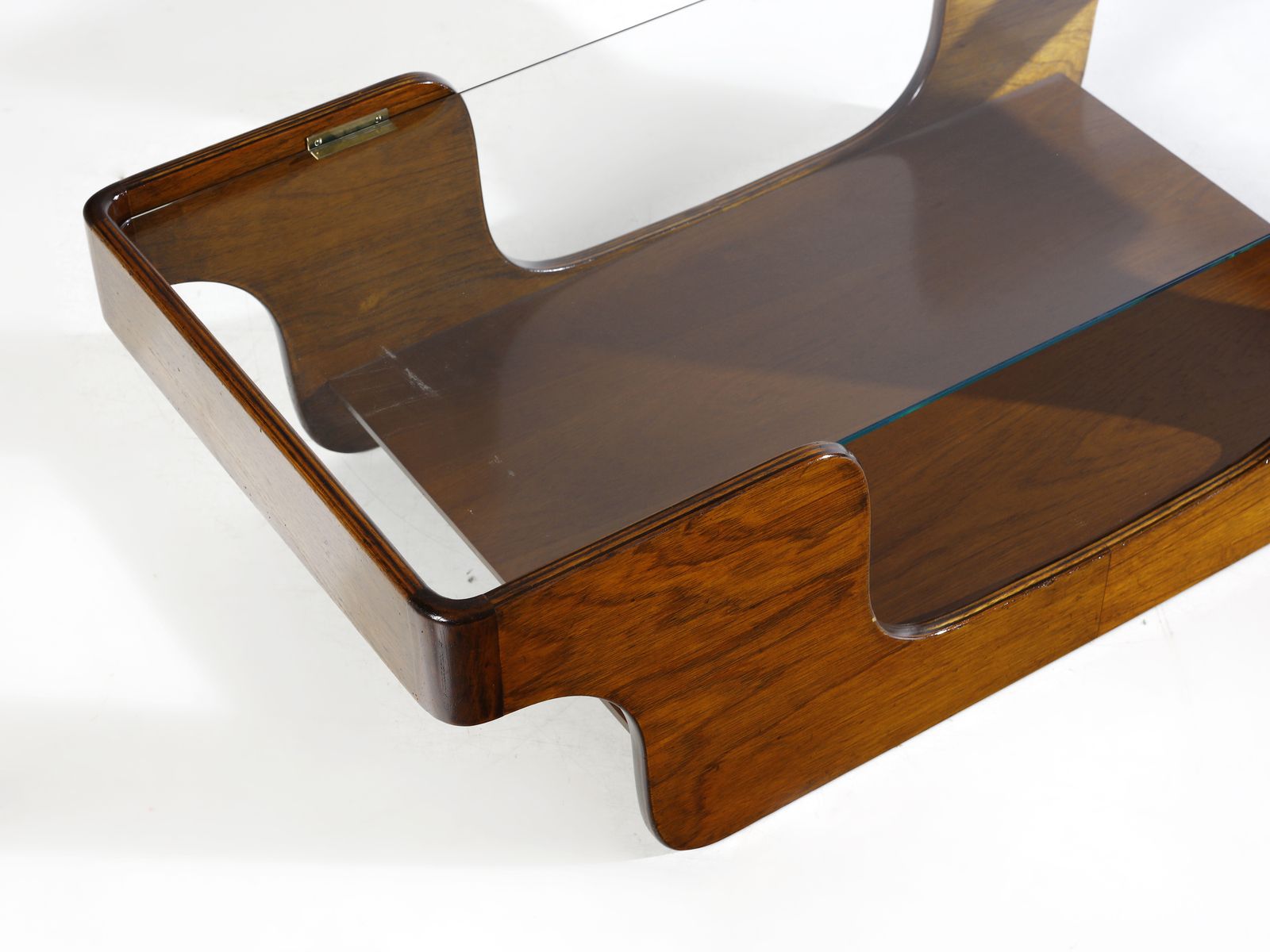 MANIFATTURA BRASILIANA Tavolino da salotto. Legno di palissandro e vetro.. Cm 36x116x54. Anni Settanta.