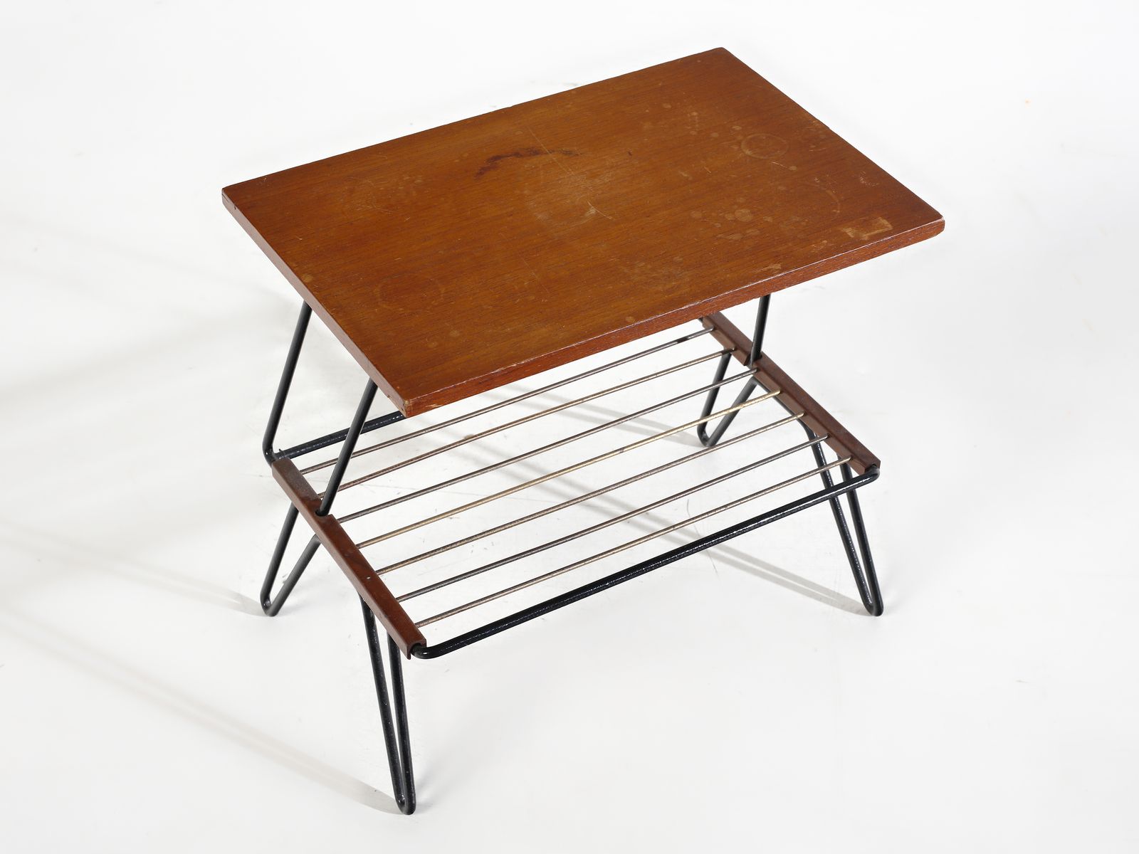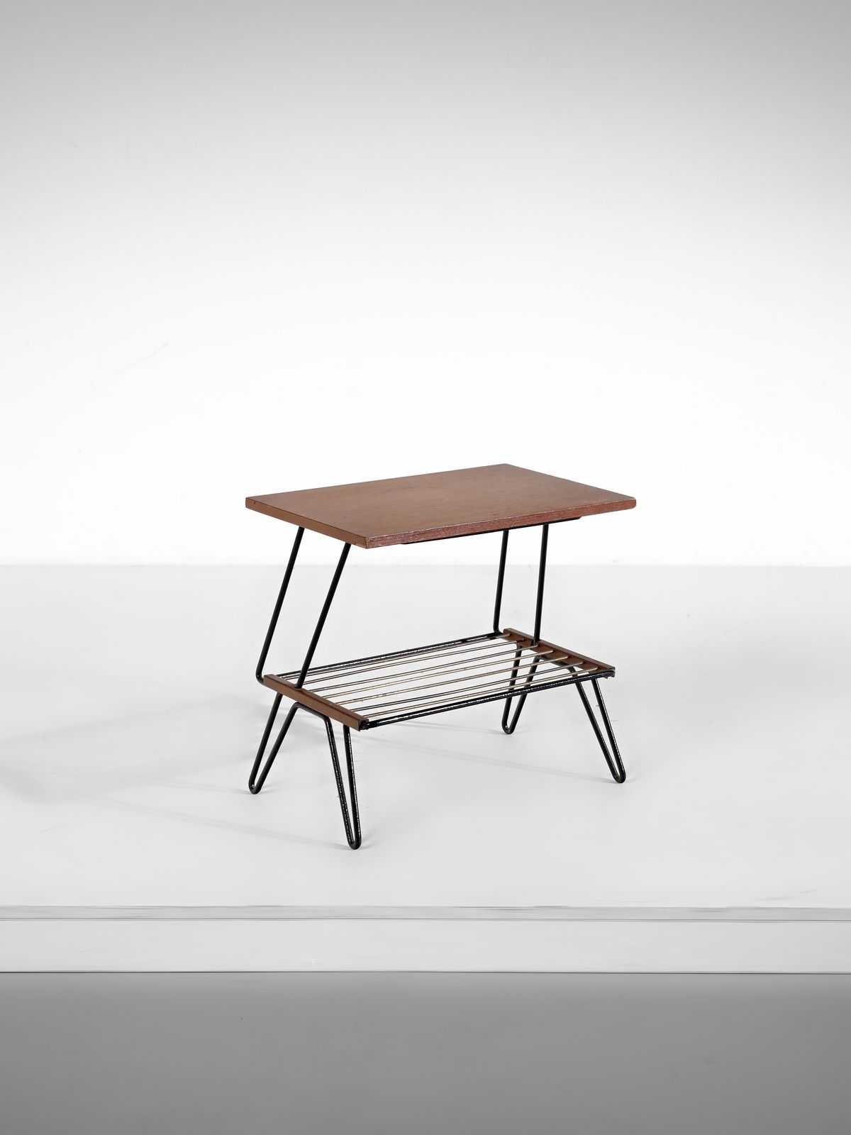 MANIFATTURA ITALIANA Tavolino portariviste. Legno, metallo verniciato e ottone.. Cm 48x55x35. Anni Cinquanta.