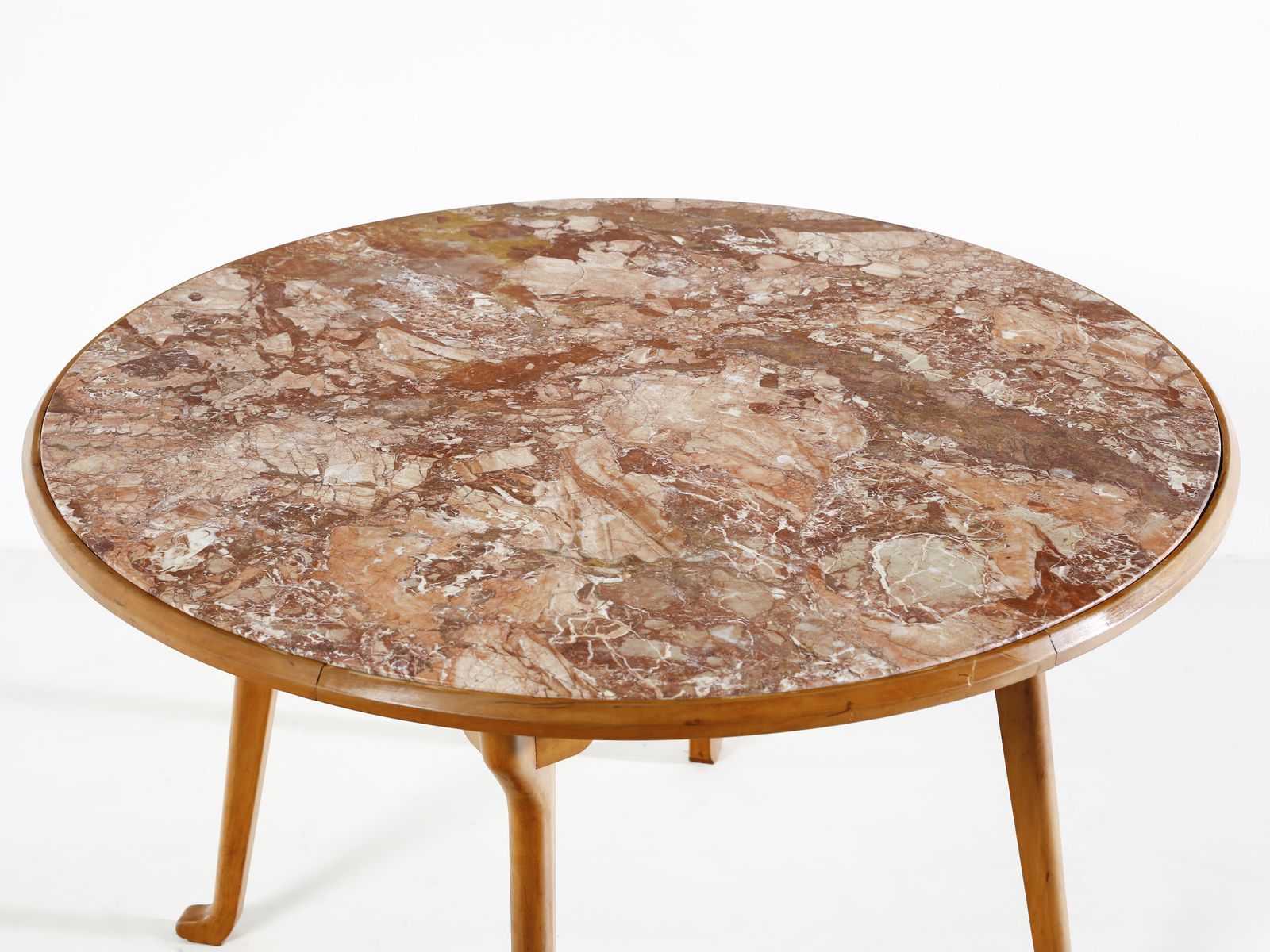 MANIFATTURA ITALIANA Tavolo. Legno e marmo.. Cm 78x124x124. Anni Cinquanta.