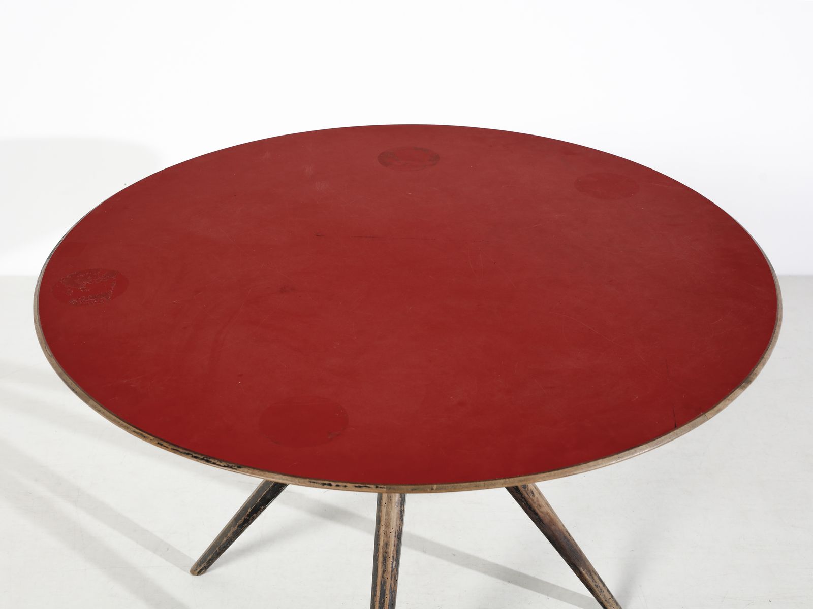 MANIFATTURA ITALIANA Tavolo. Legno, ferro e laminato.. Cm 71x120x120. Anni Cinquanta.