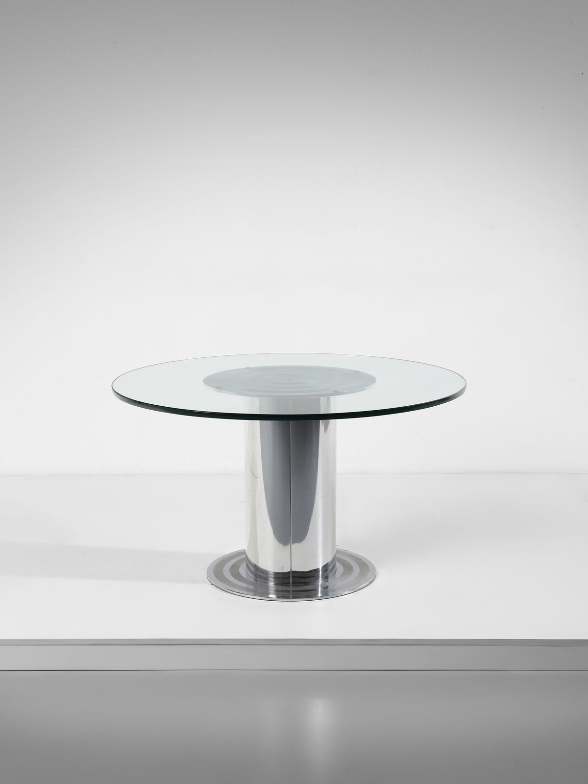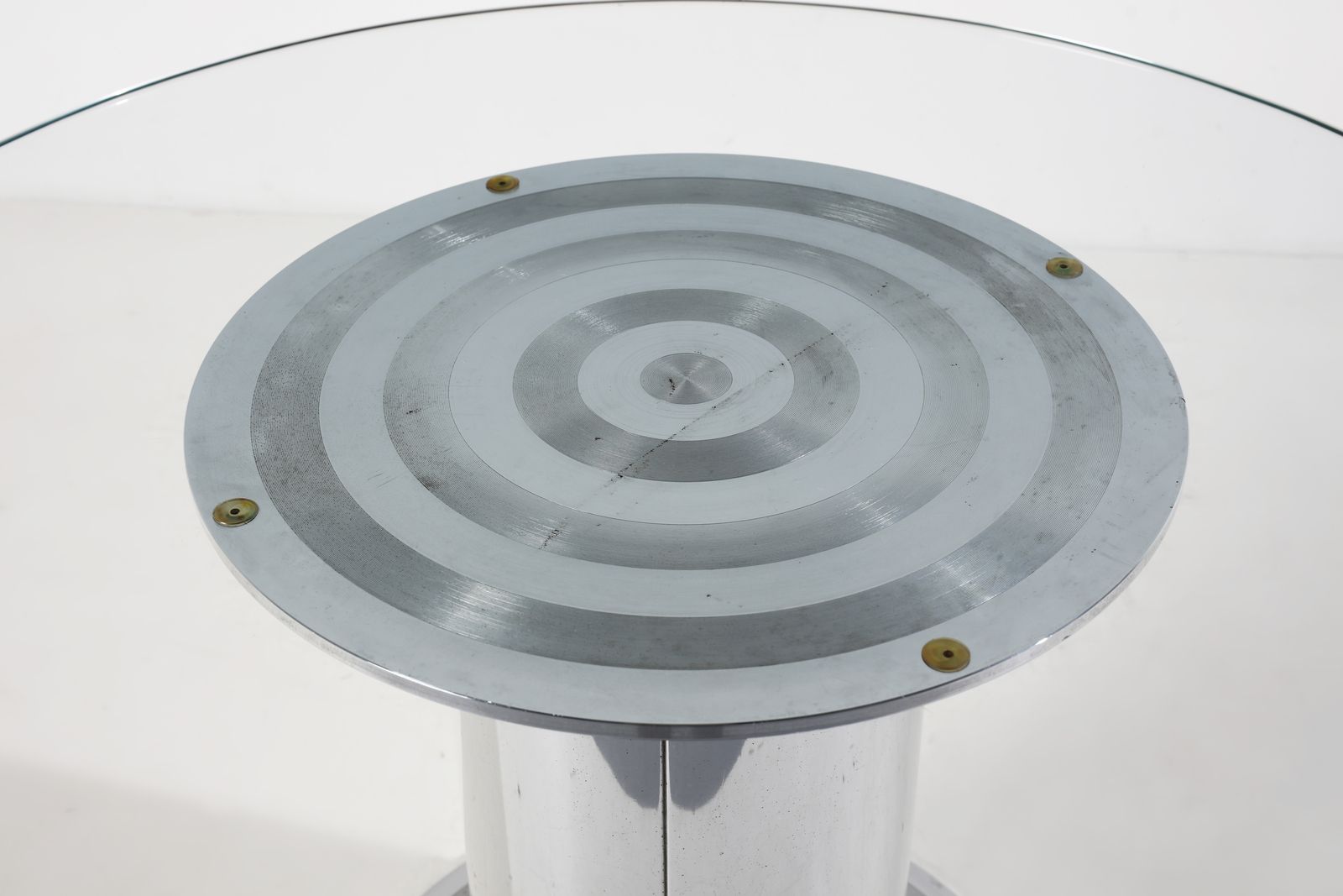 MANIFATTURA ITALIANA Tavolo. Acciaio cromato e cristallo.. Cm 69x119,50x119,50. Anni Settanta.