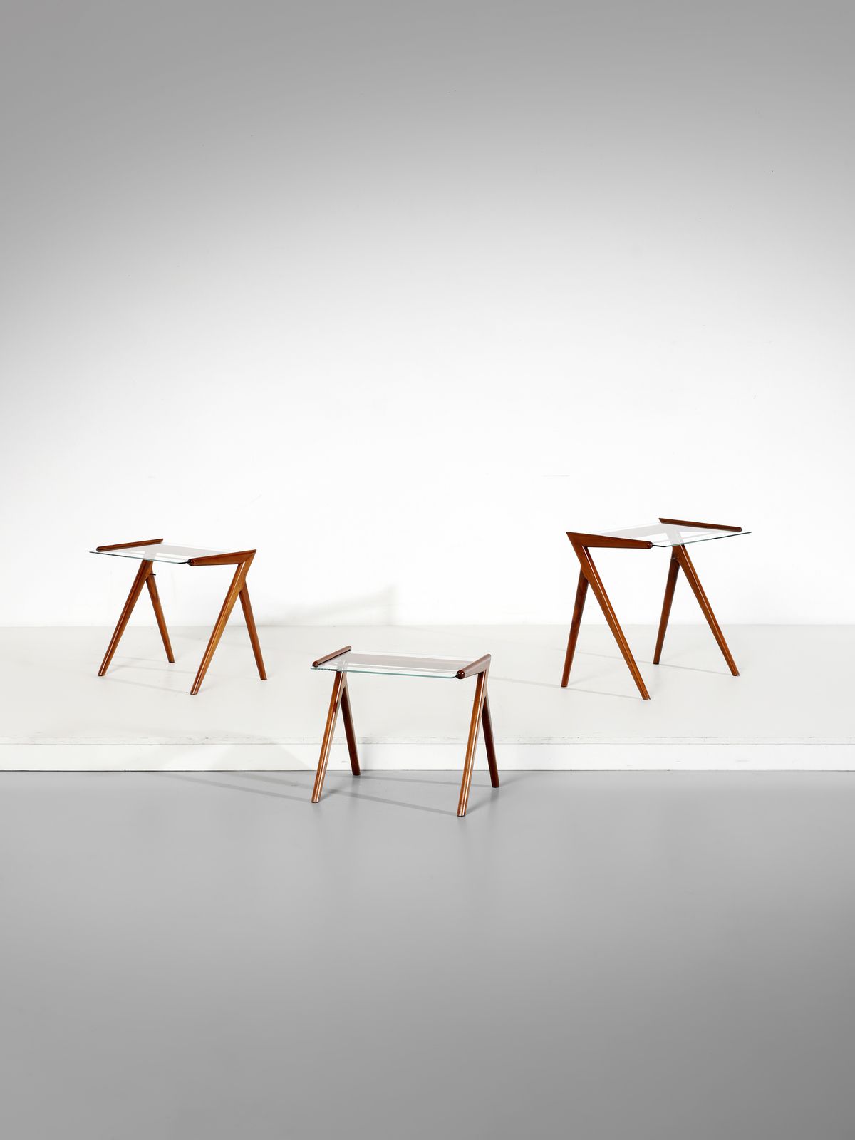 MANIFATTURA BRASILIANA Tre tavolini da salotto. Legno, vetro e ottone.. Cm 53x46x40. Anni Cinquanta.