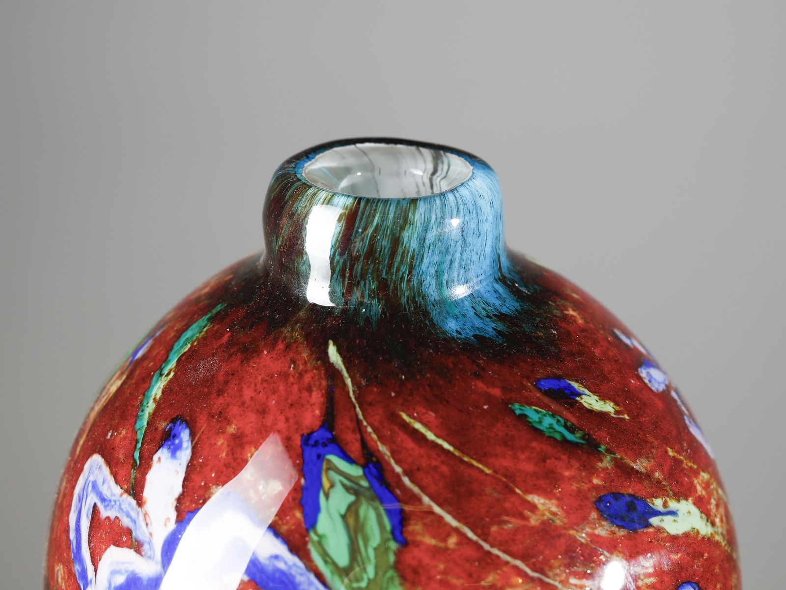 MANIFATTURA MURANESE Vaso decorato con motivi vegetali. Vetro incamiciato con graniglie policrome.. Cm 34x15x15. Anni Ottanta.Firma a punta non pertinente ' H.St. Lerche' sotto la base.