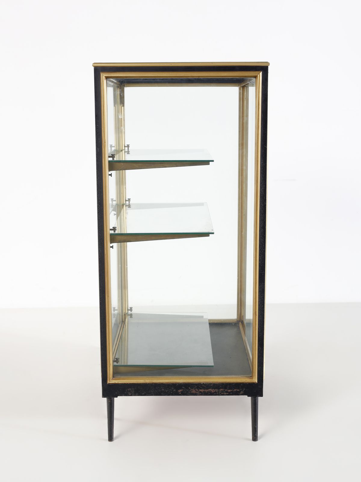 MANIFATTURA ITALIANA Vetrina a tre ripiani con ante scorrevoli. Cristallo curvato, vetro lattimo, ottone e metallo verniciato.. Cm 104x71x46. Anni Sessanta.