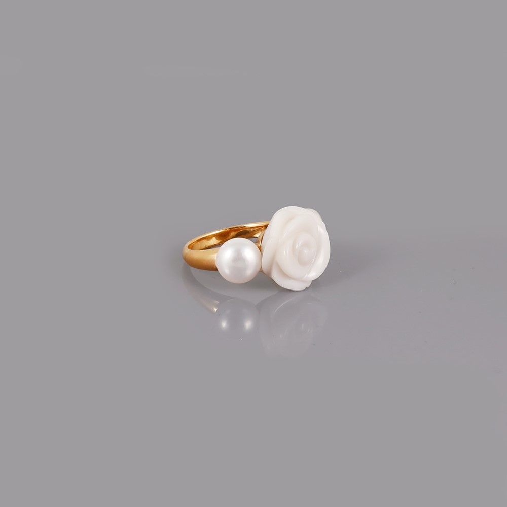 in oro rosa con agata bianca modellata a guisa di rosa e perle d'acqua dolce, gr. 7,8. Misura 15 Firmato: Miḿ