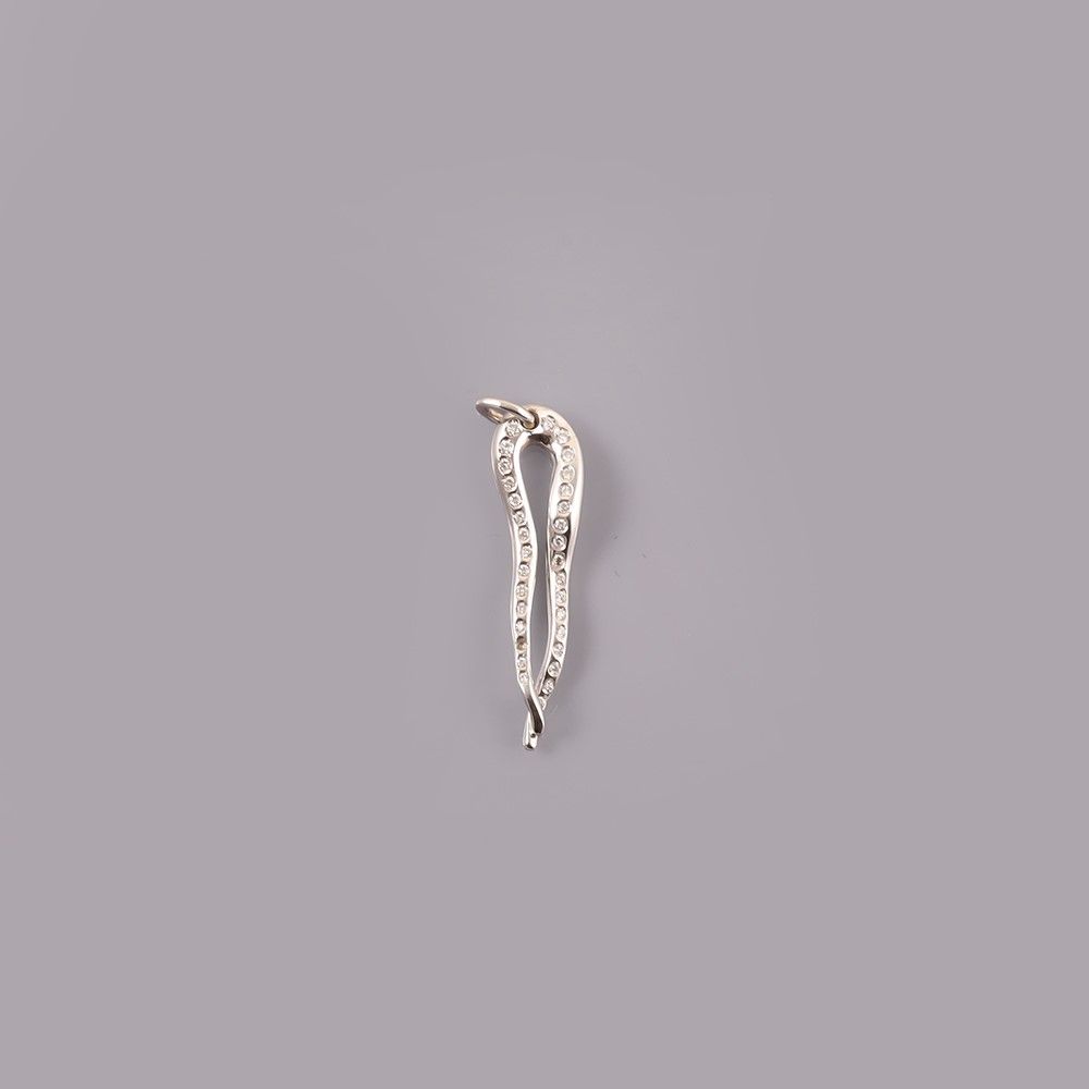 in oro bianco a forma stilizzata con brillanti (uno mancante), gr. 2,6. Lunghezza 3 cm ca. Firmato: Amadomio
