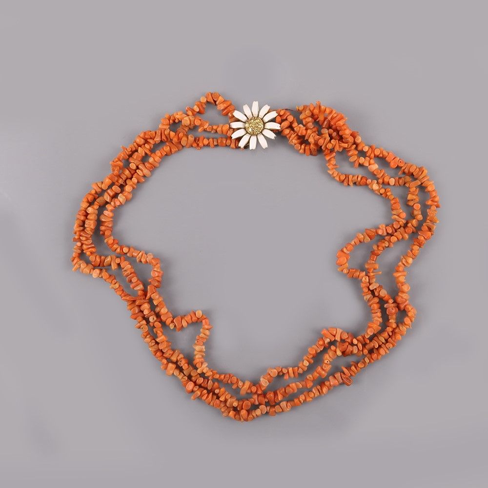 a tre fili di grani di corallo con chiusura in oro giallo a guisa di margherita con smalti e brillanti. Lunghezza 44 cm