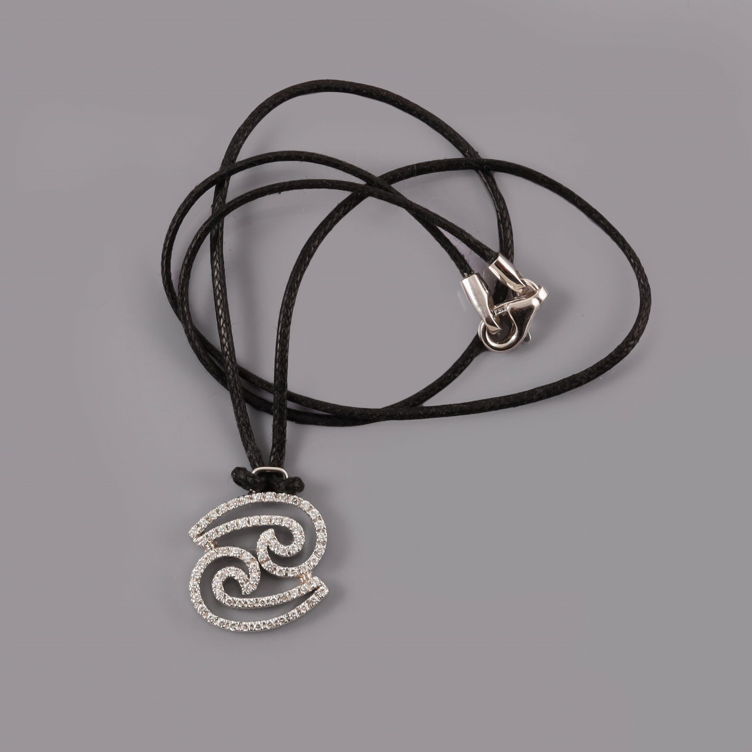 in oro bianco a volute con brillanti, gr. 3,8. Sostenuto da un cordoncino con chiusura in oro bianco. Lunghezza 39 cm Numerario: 3130 AL (Crivelli s.r.l. - Valenza)