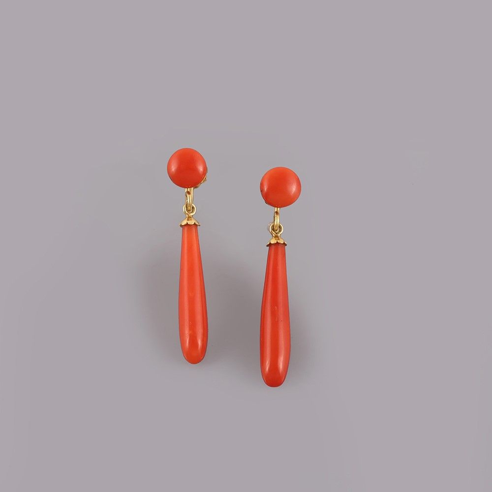 pendenti in oro giallo con coralli, gr. 6,5. Lunghezza 4,5 cm ca.