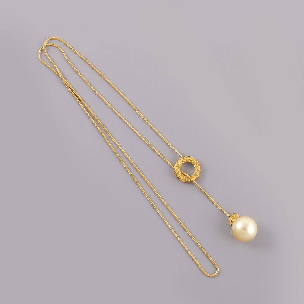 in oro giallo a 'coda di topo' con anello in pavé di corindoni gialli e perla coltivata 11 mm ca. che funge da chiusura, gr. 8,2. Lunghezza 45 cm ca.