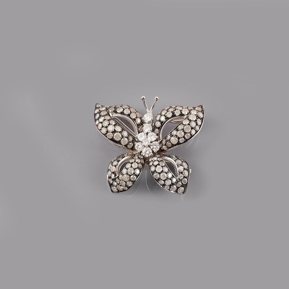 doppio uso, in oro bianco parzialmente brunito, a guisa di farfalla con corpo in brillanti e ali in diamanti 'icy', gr. 12,1. Dimensioni 3,2 x 2,9 cm ca. Firmata: Gimor