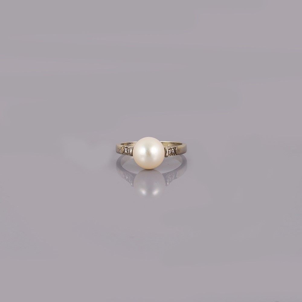 in oro bianco con perla coltivata e piccoli diamanti, gr. 3,8. Misura 16