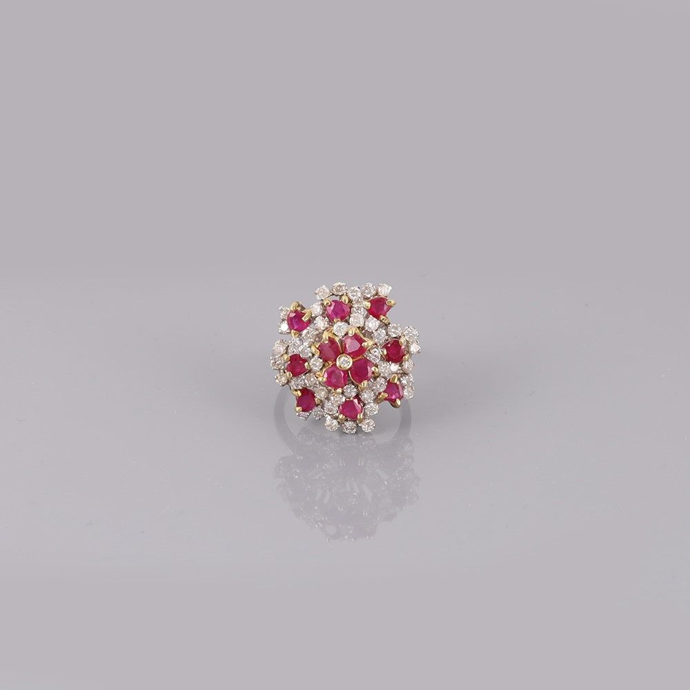 in oro bianco e giallo con motivo a rosone in brillanti e rubini taglio a cuore, gr. 10,7. Misura 17,5