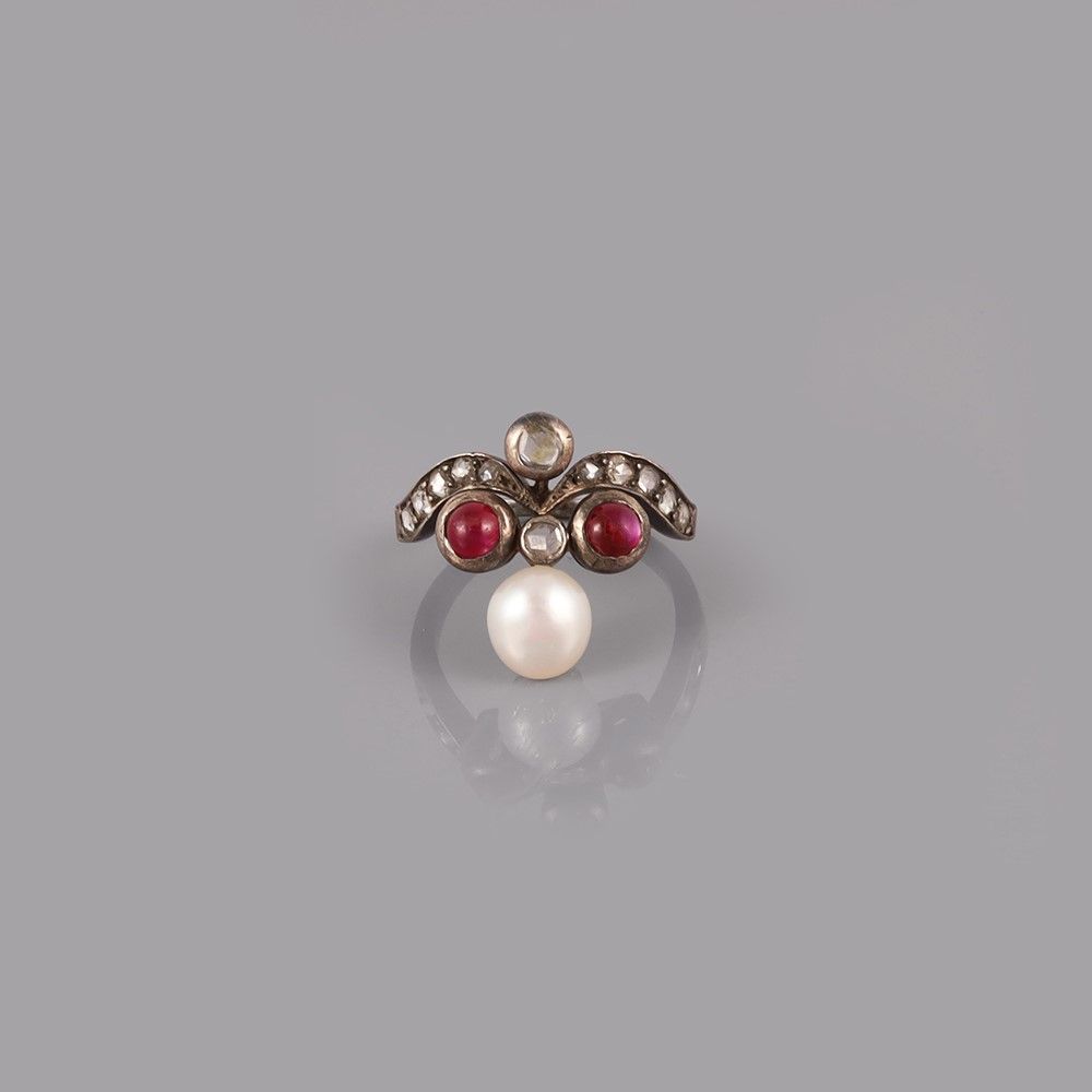 in oro con perla d'acqua dolce, diamanti taglio a rosa e rubini cabochon, gr. 5. Misura 13