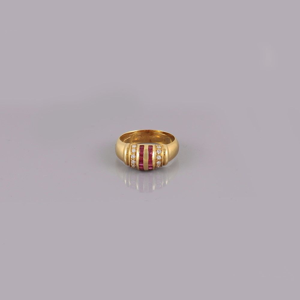 a fascia bombata in oro giallo con motivo costolato in brillanti e rubini taglio carré disposti in linea, gr. 6,8. Misura 15,5