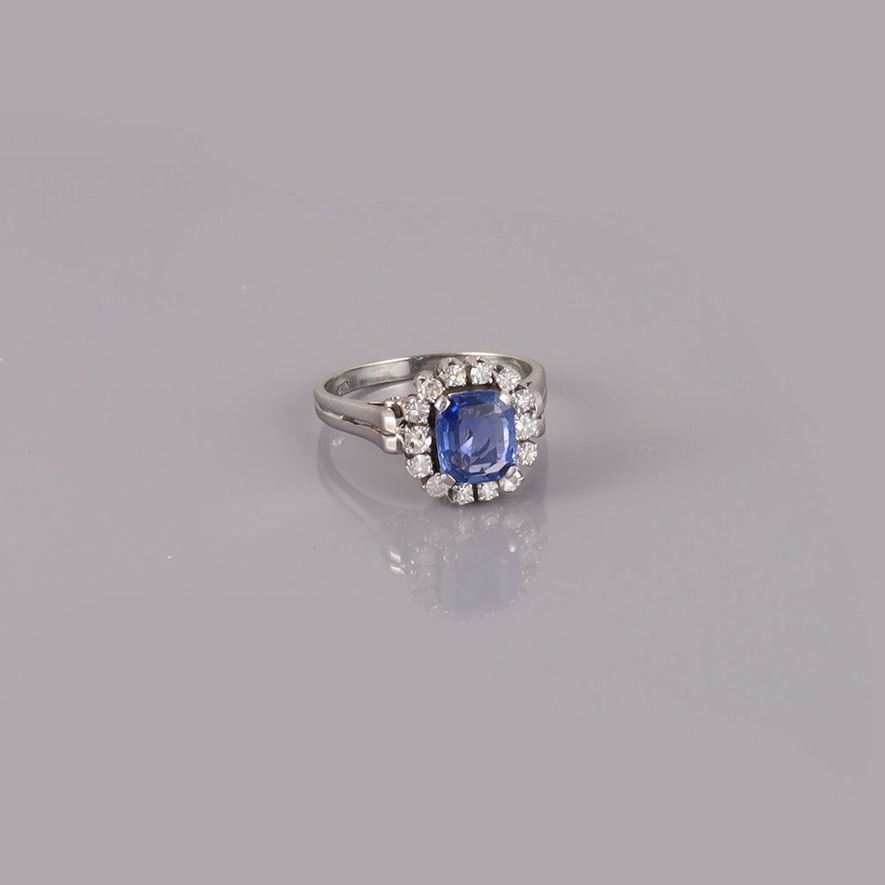 in oro bianco con zaffiro contornato da diamanti, gr. 4,9. Misura 14