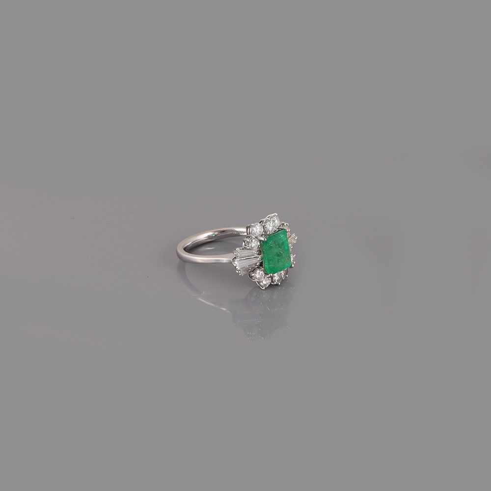 in oro bianco con smeraldo rettangolare contornato da brillanti e affiancato da diamanti taglio taper, gr. 5,8. Diamanti del peso complessivo di 1 ct ca. Misura 15