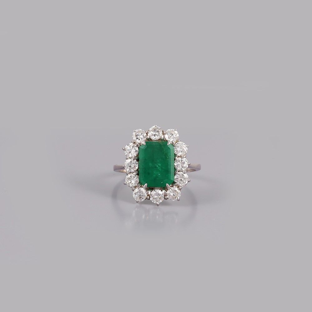 in oro bianco con smeraldo rettangolare contornato da brillanti del peso complessivo di 1,20 ct ca., gr. 4,4. Misura 14