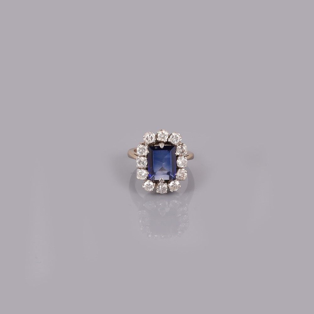 in oro bianco con brillanti del peso complessivo di 1,20 ct ca. e zaffiro sintetico, gr. 7. Misura 11