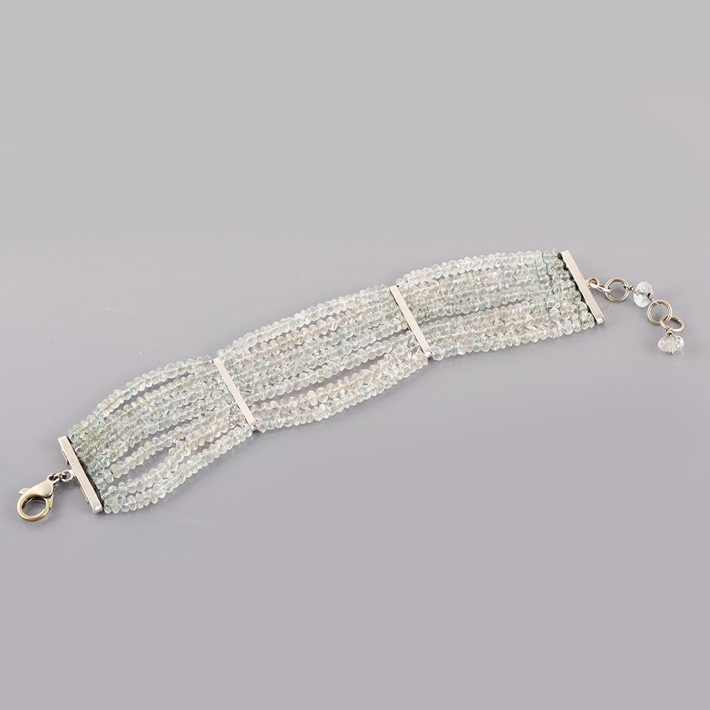 a sette fili di sferette sfaccettate di acquamarina con barrette di separazione e chiusura in oro. Lunghezza 20 cm ca.