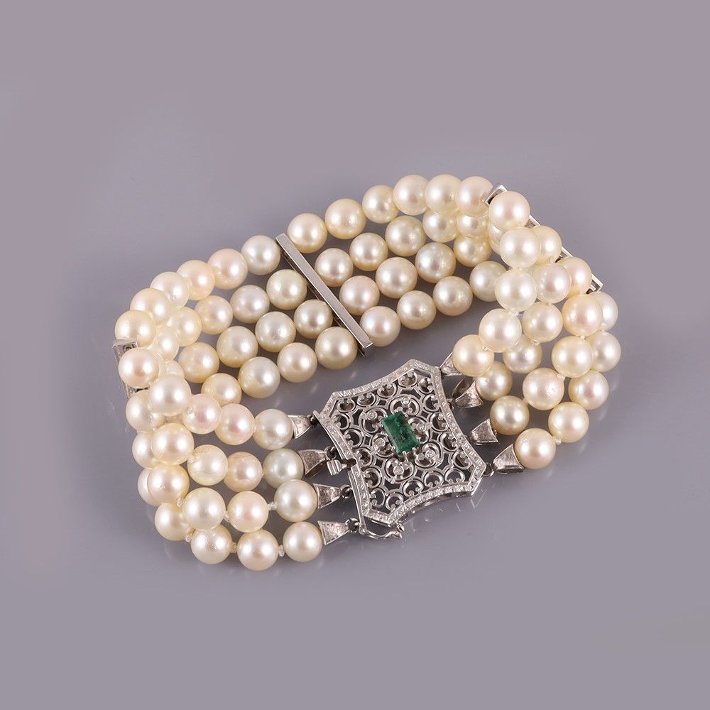 a quattro fili di perle coltivate con fermezza traforata a volute in oro bianco con smeraldo e piccoli diamanti. Lunghezza 19 cm