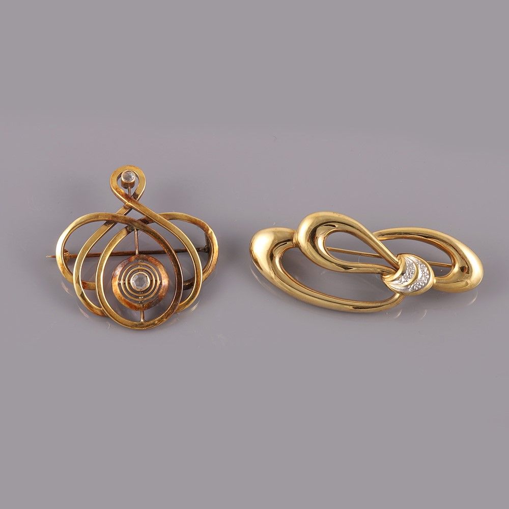 in oro giallo rispettivamente a cartiglio con diamanti taglio a rosa e a nastro con piccoli diamanti, gr. complessivi 10,8. Dimensioni 3,5 x 3,5 cm e 6 x 2 cm ca.