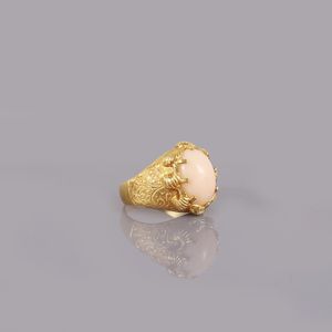 in oro giallo a cupola finemente cesellato a volute e ghirlande, sormontato da un corallo rosa taglio cabocon, [..]