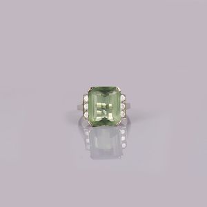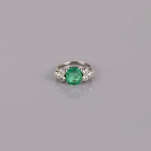 in oro bianco con smeraldo ottagonale affiancato da brillanti, gr. 4,3. Misura 14,5