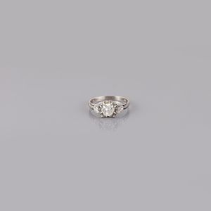 in platino con diamante taglio antico europeo posto al centro del peso di 0,70 ct ca., affiancato da piccoli diamanti, [..]