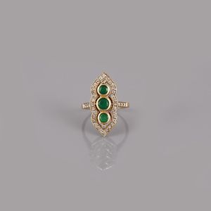 in oro giallo con brillanti del peso di 0,80 ct ca. e smeraldo sintetico, gr. 5,2. Misura 11