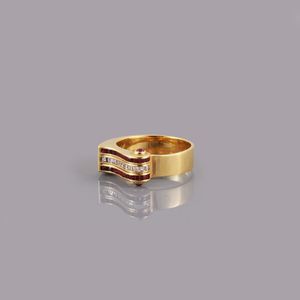 in oro giallo a fascia con motivo a voluta in rubini e diamanti taglio carré, gr. 7,3. Misura 14,5 Firmato: G. [..]