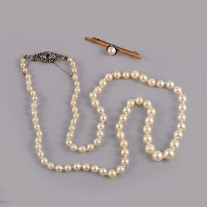 composto da un filo di perle coltivate poste in gradazione con chiusura in platino e oro e spilla in oro e argento [..]
