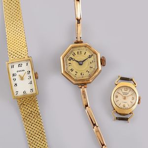 Lotto di tre orologi da donna, di cui uno con bracciale in oro basso e un orologio [..]