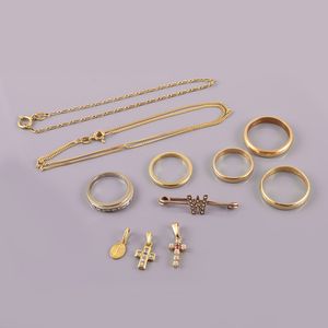 in oro, composto da quattro fedi, un anello con pietre sintetiche, un braccialetto, una catenella, due pendenti [..]