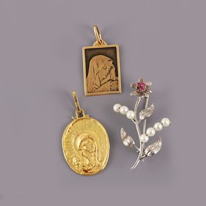 composto da due medaglie in oro giallo con raffigurazioni sacre e una spilla floreale in oro bianco con perle [..]