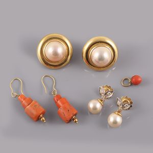 in oro, composto da tre paia di orecchini con perle coltivate, piccoli brillanti, mabč e coralli e un piccolo [..]