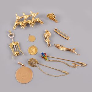 in oro, composto da sei spille e cinque pendenti a fogge differenti, gr. complessivi 36,7.