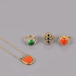 in oro, composto da un girocollo con pendente a in corallo e piccoli brillanti e tre anelli di cui uno con corallo [..]