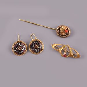 in oro a titoli diversi, composto da due spille e un paio di orecchini con smalti (mancanze), corallo e pietra [..]