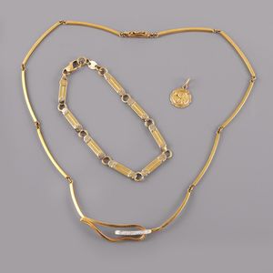 in oro, composto da girocollo con piccoli diamanti, bracciale a barrette e medaglia, gr. complessivi 26,7. Lunghezza [..]