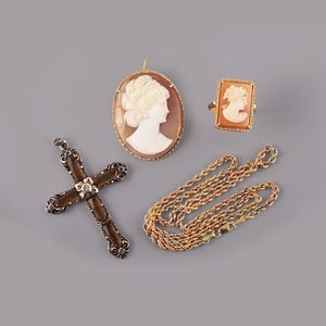 composto da spilla-pendente doppio uso e anello con cammei in conchiglia montati in oro, una collana in oro giallo [..]