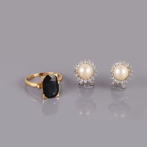 composto da anello e orecchini a clip in oro con pietre sintetiche e perle coltivate, gr. complessivi 12.