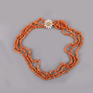 a tre fili di grani di corallo con chiusura in oro giallo a guisa di margherita con smalti e brillanti. Lunghezza [..]