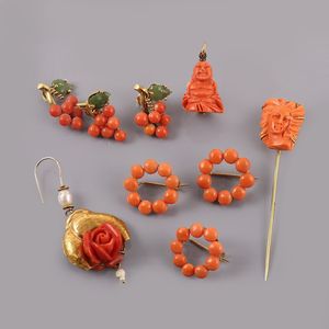con coralli, composto da un paio di orecchini e pendente a guisa di grappolo d'uva con crisoprasi, tre spille [..]