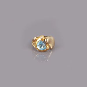 in oro giallo e bianco a fascia sagomata con topazio azzurro e brillante, gr. 7,5. Misura 12,5