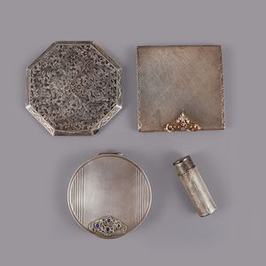 in argento, composto da tre portacipria a forme differenti, cesellati, di cui uno con riporto in oro e gemme sintetiche, [..]