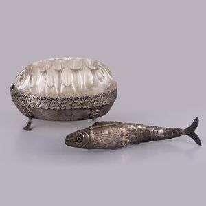composto da portafiori in argento e vetro (piccole sbeccature) e contenitore in argento a guisa di pesce con un [..]
